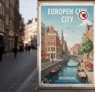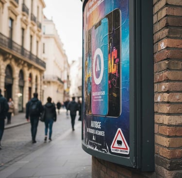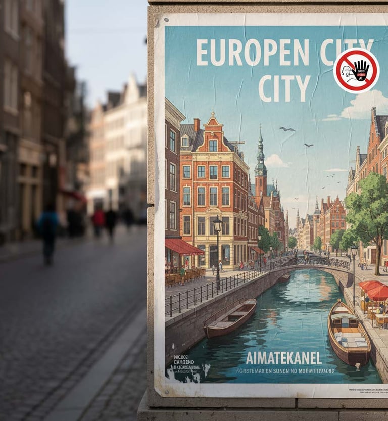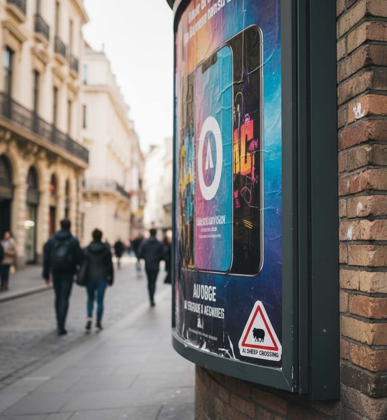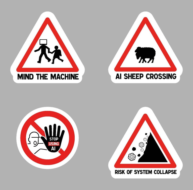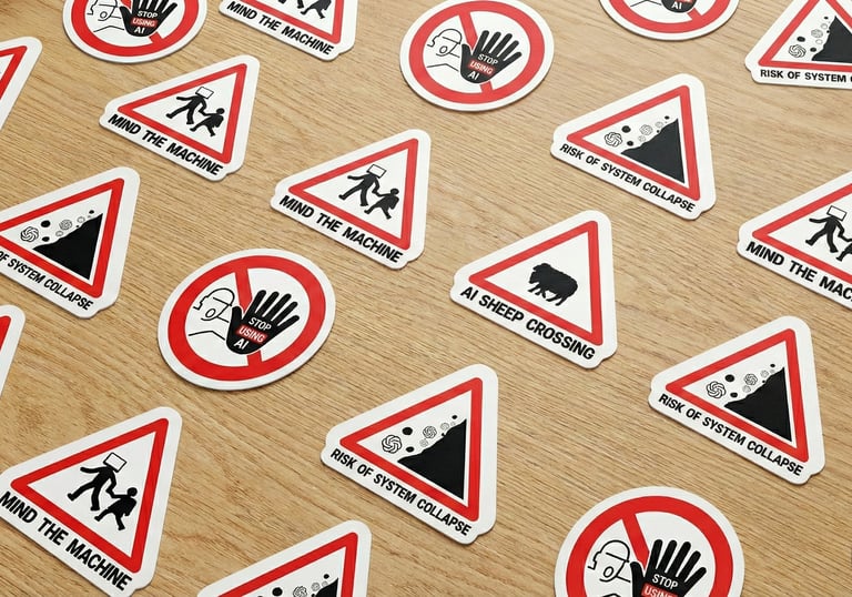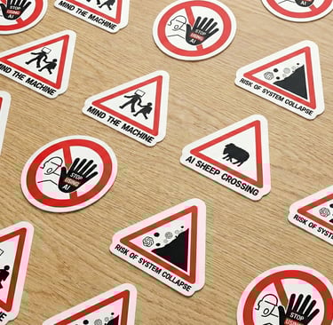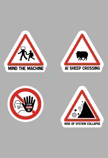 Campagne de stickers contre l’intelligence artificielle, inspirés des panneaux routiers, à poser sur des affiches générées par celle-ci.